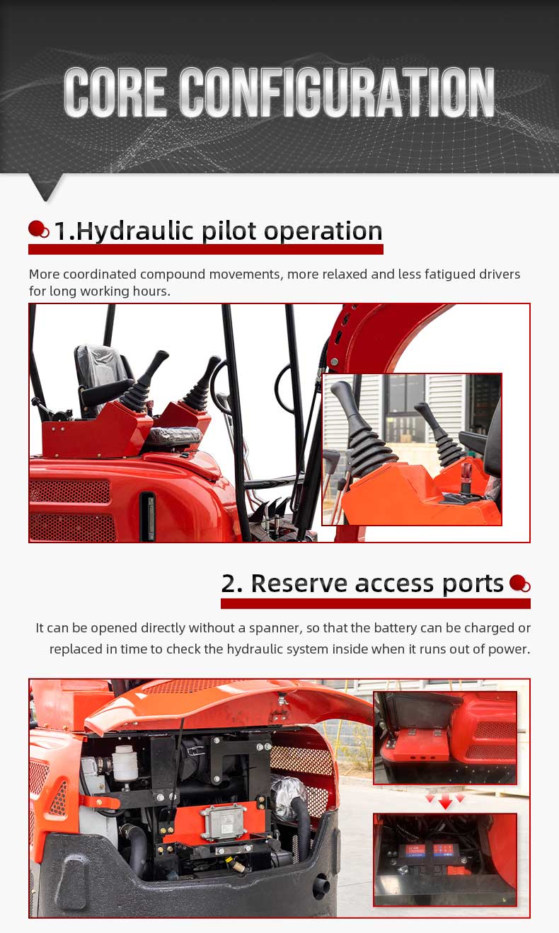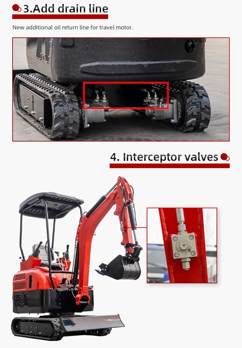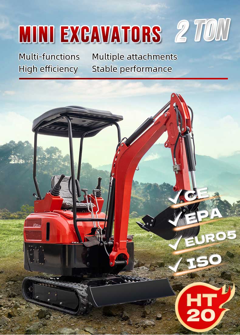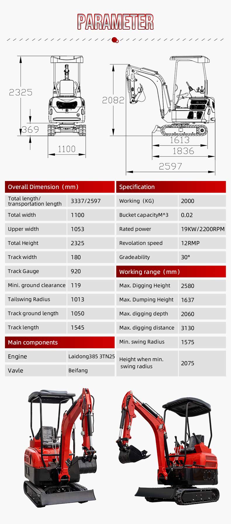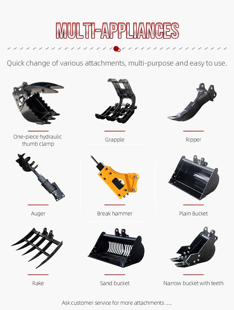 This 2ton mini excavator can be installed with hydraulic quick hitch,narrow bucket,hammer,auger,tilt bucket,ripper,rake,rotary grapple,tree shears and lawn mower.